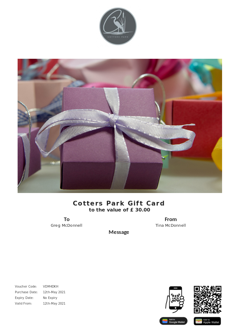 Cotters Park allows you to purchase instantly printable gift vouchers, special offers and tickets using the Voucher Connect platform.